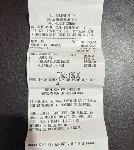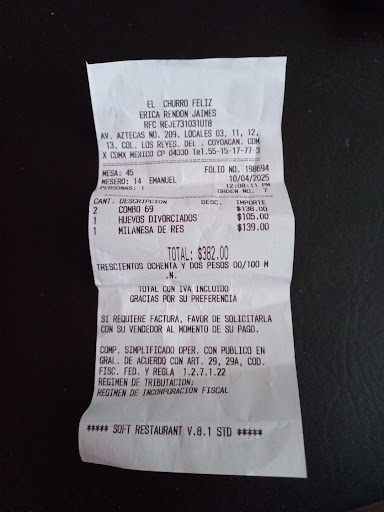 Read moreEl día de hoy 7 de agosto fui con mi familia a cenar al churro feliz de el mercado de la bola como principio solicito un menú físico y la respuesta fue no tenemos y que avía de escanear después muy amablemente me prestaron una tablet después nos tomaron la orden después de media hora nos dicen que no tienen el café para hacer los frapes de sabores ya que solicitamos uno de Avellaneda y otra de crema irlandesa bueno después tardaron nuevamente 10 minutos más para llevar las sopas solicitadas desde un inicio tardaron muchísimo para atendernos y darnos las cosas que solicitamos como limones pan pedí Nuggets para mis niños que también se tardaron termine por cancelar una crepa y una malteada nos trataron muy mal ya que nos encantaba este lugar pero por cosas como estás uno deja de ir. La señorita que nos atendió muy grosera me aventó la cuenta me hacía caras cuando le pedía algo y me contestaba de muy mal modo todo estuvo horrible que pena que un lugar tan bonito y rico este en esas...