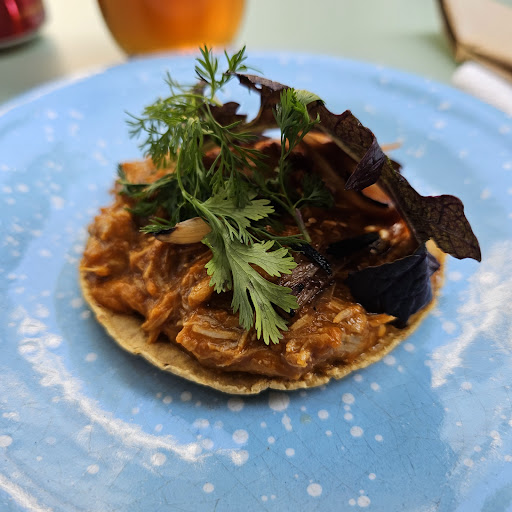 Bien, pues les platico de este lugarcín, el lugar es muy agradable, pequeño pero muy agradable, lo que me platicaba uno de los socios del lugar es que buscan rescatar algunas recetas de algunas poblaciones no muy conocidas de nuestro lindo y basto México, esto lo aplaudo, que aún existimos personas al rescate de algunos platillos que podrían seguir desconocidos o de plano desaparecer, cambian su menú cada 6 meses, vale la pena, en lo que a nuestra experiencia se refiere de inicio pedimos café de olla y pan dulce de la casa, ellos los hornean, el café bueno sólo que lo sentí un arriba de sabor a clavo, en la mezcla agregan ralladura de naranja que le dá un toque increíble, por cierto Monse la barista super amable, el pan dulce es bueno, pero algo para recordar y no dejar de probar son unas galletas de limón que son una verdadera delicia, de entrada pedimos un bocol que está delicioso, y unas tlayuditas, que para mi son demasiado pequeñas, luego de platos fuertes chilaquiles con salsa de chile puya, con suadero muy buenos pero en el límite de sal, luego un especial que eran huevos a la cazuela con chorizo de valladolid, la porción igual se me hizo pequeña y también al límite de sal pero están buenos, luego unas enchiladas ejutla que para los que las probamos hubieran sido una delicia sino estuviera la salsa tan pasada de acidez,el jugo de naranja excelente y el café americano vale mucho la pena, no dejen de probarlo, en general bien, espero poder regresar a probar más cosas en horario de comida, te quedas con esa incógnita de que más sorpresas de sabor te brindarán, es un lugar que debes visitar si o si, para probar sabores distintos a lo mismo...