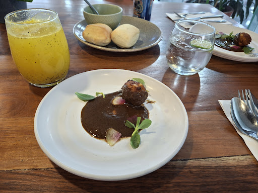 Fue el descubrimiento del semestre, pedí un plan universitario , que incluye Entrada, Sopa, Plato Fuerte y Postre, no incluye bebidas. No entendí muy bien la mecánica, pero el precio varía dependiendo del tipo de proteina, en este caso Salmón por 220 (Sept/2025), un precio muy bueno por los alimentos que que recibí. Los complementos extras fueron una Bebida de Mago-Maracuya , unos Tacos de Marlin y Camarón, un tarta de manzana con crema montada. La entrada de wste dia fue una croqueta de plátano macho con Queso en un espejo de Mole, buen sabor y lo picosito del mole abre el apetito, La sopa no estoy seguro por no preguntar pero me parece que fue un caldo de carne, bien caliente una sabor agradable y da una sensación de confort al probarlo, el plato fuerte fue un Filete de Salmón sobre un pure de calabaza za dulce, cocido a la perfección, bien sellado y suave al separar la carne, cubierto de un salsa de corazones de alcachofa, una buena experiencia en cada bocado, para finalizar fue un brownie de chocolate con salsa de chocolate Turin, el Agua fue fresca y dulce , se llevó bien con los platillos. Los complementos fueron también una agradables sorpresa, los tacos de Marlin y Camarón muy bien sazonador con toques leves de picante muy agradecidos, se recomienda unas buenas cucharadas de salsa verde, para que la acides del tomate suave y se mezcle en cada bocado. La tarta de manzana servida caliente, con una textura buena , junto con los frutos rojos y la crema , una muy buena experiencia. Hay áreas de oportunidad con la mesera, pero si van abierto para probar los sabores que ofrecen, no abra decepción alguna . El pan complementos bueno. Totalmente recomendado, vayan es una muy buena opción dentro de CU, es popular sin estar abarrotado, dudas del menú, hay otras opiniones que...
