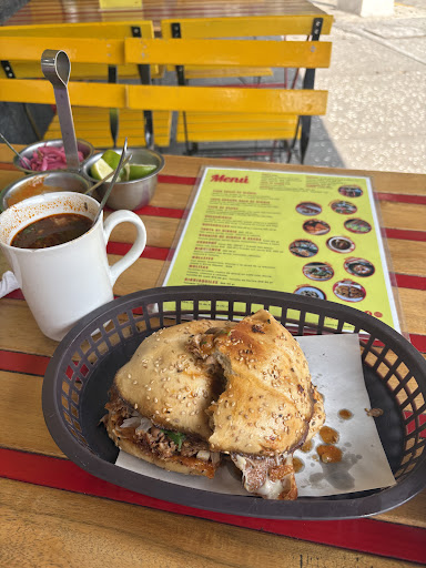 Pedí una torta de birria,un taco de asada,un consomé y un vaso con agua de horchata. En cuanto a la torta de birria,la porción me pareció pequeña por el precio,realmente esperaba un poco más de carne. El pan era rico pero igualmente el tamaño muy chico para mi gusto. Algo que aprecio es que pese a que estaba dorado con algún tipo de grasa (no recuerdo si tenía queso,pero si tenía no sabía ni se sentía),no se sentía grasosa la torta,puntos ahí. Mi otra queja serían los frijoles enteros: honestamente no sé si la birria estilo Tijuana los tenga,pero en una torta … se sienten raros,además de que no tenían un sabor reseñable.// Sobre el taco,diría que la porción fue buena,tenía igualmente frijoles (aquí no se sentían mal pero en cuanto a su sabor,lo mismo),guacamole (lo abordo más adelante),la carne,una salsa y verduras. El sabor de la carne no era especialmente bueno,de hecho le hacía falta sazón,supuestamente está marinada pero entonces no sé si le pusieron sal al momento de hacerla o no. La tortilla bien. // El consomé creo que fue lo mejor que pedí,tenía buen sabor,buen cuerpo (no estaba excesivamente líquido o claro),y tenía un poquito de carne sin,además,tener mucha grasa. Al consomé específicamente le daría un 8/10 porque si bien tenía sabor,le faltaba sal y le tamaño no es muy grande (es una taza). // los complementos fueron lo más decepcionante porque ninguna salsa picó (que ya sé que apelan al paladar gringo,pero al menos tener una opción picante o algo así),pero además sí les faltaba sabor,incluso a las cebollitas encurtidas que tenían. // El agua,cumplidora sin más. //