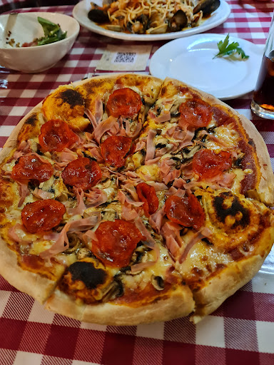 Muy rico, pero ve preparando tu cartera. El día que fui con mi familia, era día de las madres, el servicio fue deficiente justamente por la gran demanda de atención del día, creo yo que en un día menos ajetreado el servicio mejora muchísimo. Lo que pedimos, mi familia y yo, fue un pequeño antojo, en este caso fueron las Brusquettas, pan tostado, creo yo con mantequilla, acompañados encima de jitomate, pedazos de queso, aceite de oliva y albahaca, una delicia, cuestan caro, pero, si los repartes bien, pueden ser una gran entrada. De platillo principal elegimos mitad pizza Margaretta, y mitad Pepperoni, muy rico. La primera queso, salsa italiana y albahaca, esto último le da su sabor característico, y, por supuesto, la taradicional Pepperoni, bien cocinada, queso derretido y deliciosa salsa de jitomate. Cómo conclusión, los platillos y las bebidas son caros, puedes comer en otros lugares con precios más accesibles, sin embargo, el sabor es delicioso, si quieres pasar un buen rato familiar, con una comida bien sazonada, y sin miedo de soltar el varo, échale a...