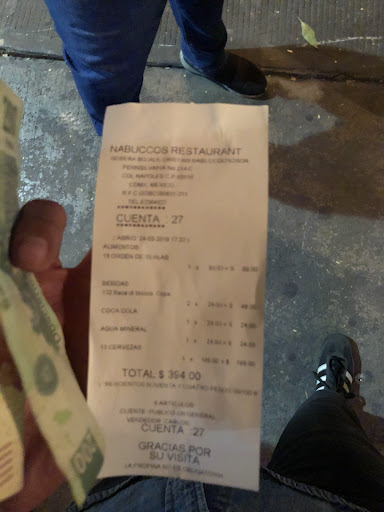 Después de un cheleo rodeado de un servicio que lejos de aportar, degradó la experiencia que intentaba salvar por encima de los gritos de Belinda en la TV, decidimos dejar una propina más bien simbólica de nuestro disgusto. Lo que no esperábamos es que el mesero aplicara la Usain Bolt y se echara una carrera para alcanzarnos cuando ya estábamos a media cuadra de distancia para pedirnos que completáramos el 10% porque si no se lo iban a cobrar a él. Qué vergüenza de la administración en caso de que sea cierto. De cualquier forma, qué vergüenza en sí mismo de Nabuccos por propiciar que los meseros vayan a exigir más lana a la calle.
