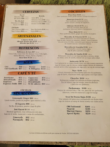 Read moreI was looking for a Peruvian restaurant in Mexico City and found a few of them. This one was one of them. I went there with an expectation of classic Peruvian dishes but didn’t find too many. This was more of a cevicheria and seafood restaurant. I decided to get myself a papa a la huancaina and a ceviche carretillero. Both dishes came out delicious. Reminded me of Peru. There was just a system error on their printed menu which said that their ceviche carretillero didn’t have shrimp so I order it since I’m allergic to shrimp, but when I got the ceviche, it had shrimp. They were quick to change the plate so no biggie. I should of gotten a discount for that but whatever. As far the flavor of the food and its authenticity, it was quite delicious and tasted like food in Peru. Only Peruvians know what good Peruvian food taste like. It’s just embedded in them from mom’s and family cooking. Their chef is also Peruvian and trained by Gaston Acurio so you know you’re getting authentic Peruvian food.
