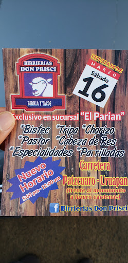 Por muchos años he visitado Pátzcuaro pudiendo conocer casi todos los rincones de la ciudad, en esta ocasión por recomendación de un amigo fui con mi familia a almorzar en domingo al lugar de Don Prisci situado en el camino al muelle. Como estaba lleno tuvimos que hacer fila, fuera había por delante unas cuatro familias, me agradó que la espera no fue mayor de 10 minutos para que nos asignaran mesa. Una mesera de inmediato nos tomó la orden y no pasaron ni 15 minutos cuando ya estábamos probando la exquisita barbacoa que sirven con tortillas recién hechas lo cual definitivamente se agradece porque en mi opinión resaltan el sabor de la carne junto con una deliciosa salsa (pienso que podrían mejorar sus salsas) Me agradó que cuando pedí la cuenta me la llevaron impresa detallando cada artículo consumido y su precio lo cual en muchos establecimientos parecidos no hacen, sólo te dan la cantidad a pagar sin molestarse en hacer un desglose lo que siempre me deja con la sensación de que pudieran estarme cobrando de más. Por todos los puntos favorables que mencioné, este lugar merece una calificación de 10 sin dudarlo regresaré la próxima vez que visite la ciudad. Pude ver que justo a un lado de la birrieria está otro restaurante llamado mariscos Prisci que también tendré que conocer y ya...
