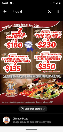 Les puedo compartir una esperincia la cual no me avía pasado en la gastronomía un lugar de ambiente un lugar para disfrutar un lugar con comida de primera pedí una orden de alitas y deverian de ver la sorpresa ke me lleve a el ver el riko y delicioso plato ke me mandaron una delicia proseguí a el comerlas y no señores y señoras un manjar algo eskisito algo ke mi paladar jamas avía esperimentado me sentí pribilegiado en un manjar de dioses si yo puedo recomendar la pizza y pero sobre todo la orden de alitas se los recomiendo el mejor lugar para comprar alitas en Morelia Chicago pizzas no muy lejos de tu lugar de destino lo mejor ke cuentan con un excelente servicio a domicilio y más con una experiencia en su cocina de más de 20 años con las resetas más antiguas para preparar y disfrutar de un buen sabor para tu paladar en su domicilio el cual tienen un servicio de primera la atención desde ke llegas lo rápido ke te atienden y te toman la orden y la ajilidad ke tienen para atender a la clientela en su local un lugar para recomendar se encuentran en...