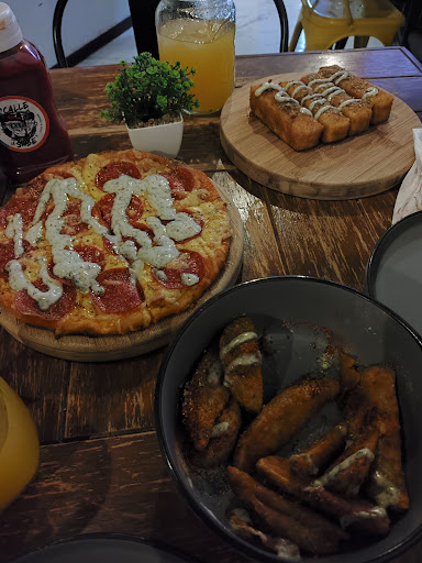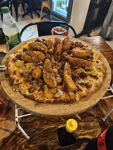 El lugar esta muy chiquito solo cuentan con 5 mesas, y el tiempo de espera si es considerable, pedimos pizza volcánica de Burguer y de nachos con arrachera, la verdad consideramos que le falta sabor, ya que no sabes ni que estás estás comiendo no tiene sabor, el queso que le ponen en medio que es lo que la distingue de las demás la verdad está frío, el pan si es tipo galleta pero da un olor a la pizzas de little caesars y de hecho si te queda ese olor, en mi punto de vista no me parecieron buenas, se me pasaba mencionar que te dan unos panecitos rellenos de queso durante la espera pero aún así es mucha la espera y sin contemplar que otras personas llegaron mucho después que nosotros y su orden salió primero que la de nosotros, creo que para una vez es más...