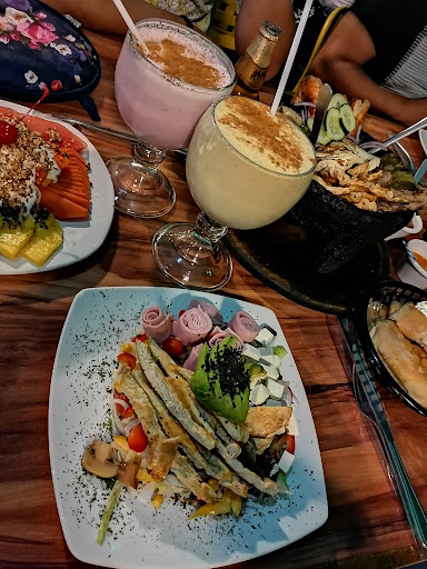 La carta o menú incluye carnes rojas, blancas como pollo y pecado; ensaladas, malteadas, molcajetes, chamorros, etc. Todo esta delicioso, y los platos son bastos, el costo es accesible promedio, puedes pasar un grato momento. El servicio es bueno. No tiene música ambiental.