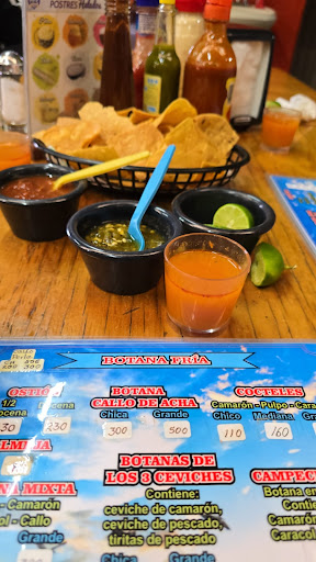 Read moreEl servicio es excelente, el lugar regular. La comida buena y los precios normales. El caldo de marisco es muy sabroso. Las tostadas de ceviche regulares. Los camarones al ajillo muy ricos y el huachinango dorado delicioso. No hay lugar para que los niños jueguen. Pero a un lado está el parque para llevarlos un ratito...