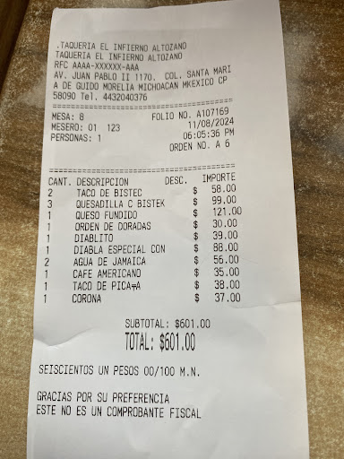 Pésimo servicio. El domingo 7 de Mayo fui a recoger un pedido que encargue q nombre de Fernanda y lo recogí en la parte de abajo en mi coche, el mesero demasiado grosero y prepotente, puso mal mi pedido y le pedí que me lo cambiara y el me dijo que yo no le había pedido mis frijoles con queso y que él ya no los podía cambiar que si los cambiaba les caía grasa ¿? Le pedí que por favor los cambiara, me arranco el pedido de mis manos y se fue enojado, regreso y me dijo que me bajara del coche para que checara a ver si estaba bien, le dije que si y me asoto la puerta de mi coche y nos dijo que ya nos fuéramos (aun no pagábamos) mi amigo se baja del coche y le dice que que trae que si no está agusto en su trabajo que renuncie y le pedimos nos trajera la terminal para pagar, regresa nos da otra mentada de madre y le dije que con esa actitud nefasta yo no le pago que a ver cómo le hacía. Se paro afuera de la cochera sin dejarnos salir y a la misma vez le pedí que me cobrara. Horrible de verdad, desde el principio llego súper enojado y de malas y yo no sé porque, yo consumo todas las semanas ahí pero con esta regada de este mesero en mi vida vuelvo a pedir. Que lastima. Mando msj a su insta para poner mi queja y evitar ponerla aquí y...