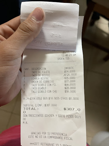 Muy buenos la verdad,,, sobre todo en lo particular las diablas,,, felicitaciones,,, y un toque extra,,, cuando llega un trovador que canta música en inglés y hace especial la cena o la comida,,, felicitaciones por permitir este tipo de músicos,,, por que ahí otros que de plano se pasan,,, tocan feo,,, y algunos otros tocan 30segundos y estiran la mano,,, una queja nada mas,,, llega todas las noches unas señoras a pedir dinero,,, ya lo hacen de plano como negocio,,, una viejita que incomoda por que ni comer deja y otra que pide cena y siempre es para llevar,,, lo Sospechoso es que no engorda y cada vez se ve mas mal,,, muy su problema,,, el caso es que incomoda,,, 10para la taquería,,, 10para el músico que toca en inglés,,, y 1 para...