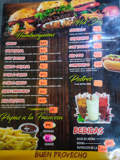 Read moreSon muy ricas estás hamburguesa son al carbón son de tamaño normal las papas y los hot dogs también están muy buenos , son amables ,por lo regular atienden rápido limpio ,me gustaría que tuvieran más variedad de agua de sabor tengo varios años consumiendo y siempre tienen solo agua de avena y bien poquita se acaba rápido y ya pues la opción...