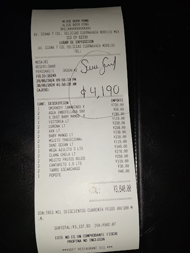 Read moreSi tienen la oportunidad de ir a éste lugar, desaprovechenla totalmente... Estuve ahí con unos amigos el sábado y todo estuvo bien hasta que llegó el momento de pagar la cuenta. Cabe recalcar que ninguno de los presentes estaba borracho como para que nos quisieran ver la cara de tal modo. Al revisar la cuenta, notamos que nos estaban cobrando 1 cerveza, 1 mojito y una orden de shots DE MÁS, obviamente al comentarle eso al mesero, quiso culpar a quiénes vió "más mal" según él, de no acordarse de lo que consumieron, aún cuando todos le dijeron exactamente lo que se habia consumido. No conformes con los cobros de más, cargaron a la cuenta el 15% de servicio (propina), cuando el mesero se fue a parar escasas 3 veces a la mesa, y yo todavía dije "bueno, si me vas a cobrar de más, entonces está bien, te pago los $3,640, pero te olvidas de que te dejé propina, tómala de todo eso que sabes que estás cobrando de más", pues para nuestra sorpresa, no te permiten la salida del establecimiento si no pagas el total de tu cuenta (lógico) pero con todo y el servicio (propina) porque viene siendo básicamente voluntariamente a 🥚.