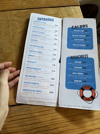 Pedimos la cevichips con Doritos y salsa jalapeño y 10/10. También me encantó el taco zarandeado de camarón. Pedí caldo de camarón y el pescado zarandeado y estaban muy ricos pero no los mejores que he comido.