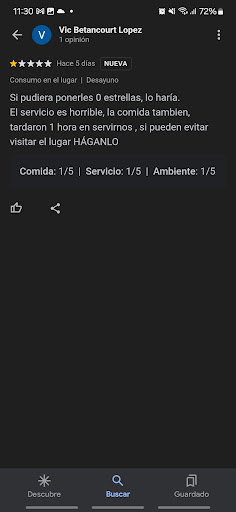 Es comprensible que la espera de una hora para ser servido pueda resultar frustrante, pero considero que expresar la insatisfacción de forma agresiva no es la mejor manera de abordar la situación. Gritar al salir del restaurante y dar una calificación tan baja sin considerar otros aspectos de la experiencia puede ser injusto y no reflejar la totalidad de lo que el establecimiento ofrece.
