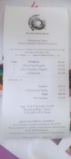 La tipa que atiende si es que se puede decir que atiende se molesta si le dices las cosas nefasta su atención además de cobrar con.isio. Por uso de la tarjeta lo cual está prohibido hacer ya que ese porcentaje tiene que ser absorbido por el local, adjunto foto del cobro de la comisión en la vida vuelvo a comprar en un local donde pare e que me hacen un favor, espero que sus donas por lo...