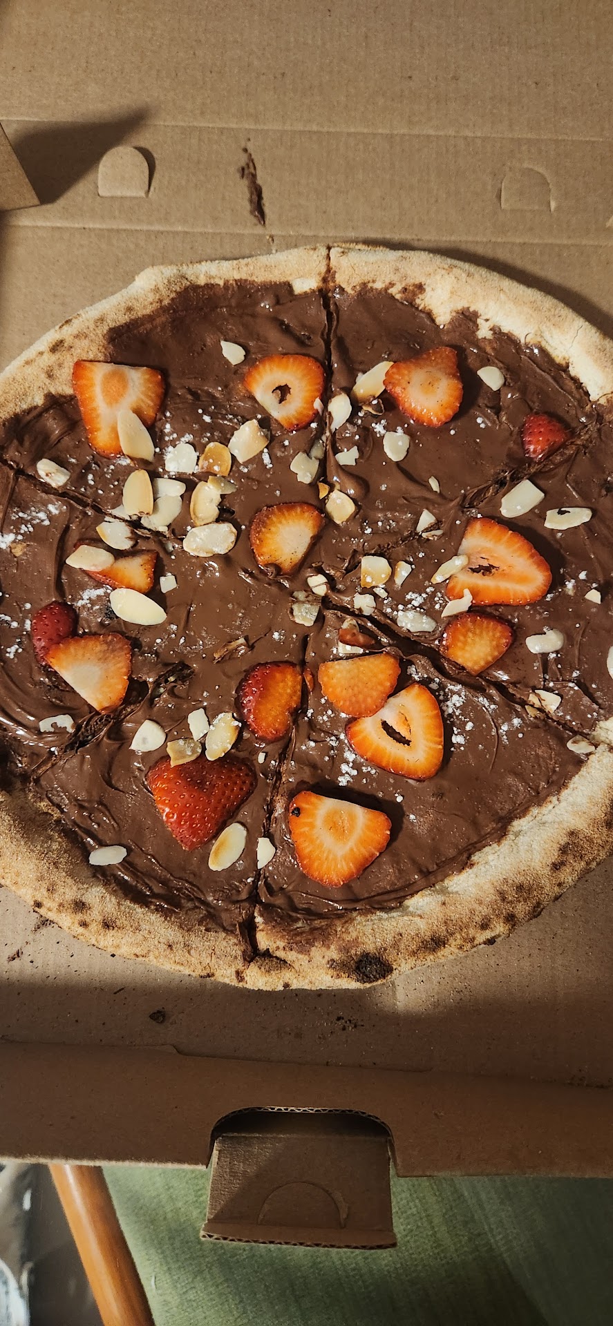 Cute little outdoor restaurant. All the staff were very friendly & attentive. Our family of 4 ordered 2 pizzas & shared them. They are each about the size of a medium pizza. The pizzas came out quick & we're very good. We ordered the dessert pizza too with Nutella & strawberries. While waiting for our dessert, there was an increase in bugs flying around. They were landing on us, on our table & in our drinks. We asked the server if we could get our dessert to go because we didn't want it to be ruined by the insects. The insect part wasn't their fault, it's just the season for them right now (late June) & as soon as they dimmed the lights down lower, the bugs decreased. The Nutella & strawberry pizza was amazing! So delicious. We will definitely come back...
