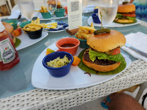 We had won coupons for the burgers, and this is a great place to cash in on them. This could have been the best hamburger on the resort, even rivaling The Burger Place. We each had the Green Table Burger (295 pesos) which included a beef burger, roasted portobello mushroom, cheddar cheese, onion rings, lettuce, and tomato. The onion rings were nice and crisp. There was also a small appetizer of hummus and some chips. Each page also had crisp, thick fries and a...