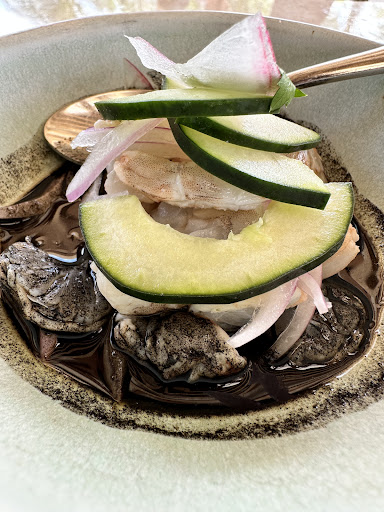 Black Aguachile shrimp: 100 grams of shrimp, Serrano Chile, cucumber, red onion, cilantro, & lime juice. Strongest flavor of the 3 dishes, slightly spicy/but delicious, and our favorite of everything.