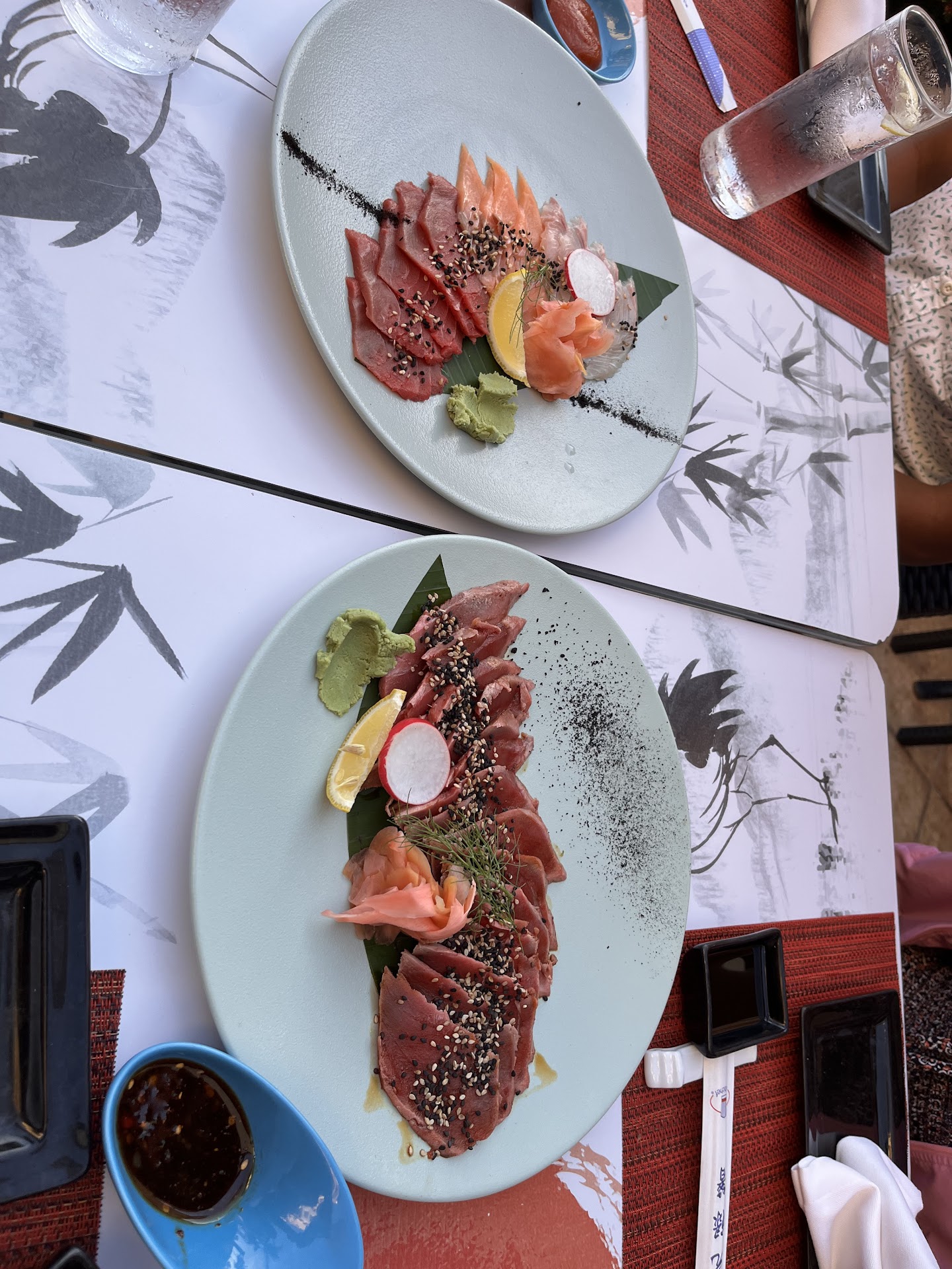 We made reservations with specific request to sit out side. No problem scheduler says. She also informs us there is a dress code and an up charge to our all inclusive package. Ok. When arriving hostess seats us on the inside after us asking several times to be seated out side because of the strong incense burning. We sat close to a door that was 1/2 open to the out side. We ordered drink and food and as we sat we noticed that there was no dress code. People were coming in shorts, tank tops, sleeveless mens shirts. We ordered and the food took well over an hour to be served. The inside was very hot.Waiter was very apologetic (not his fault). We were treated like we didn’t matter from the hostess and the manager. The food (when it arrived) was tasty but it was not worth the hassle and the feeling of be a low...