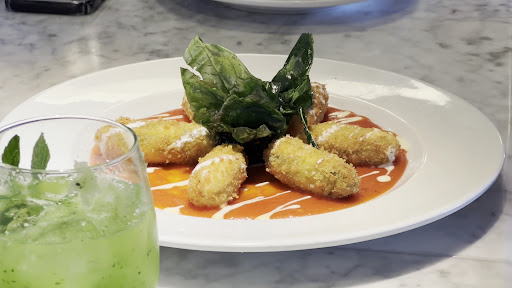 Pedimos un crema de tomate rostizado pensando en disfrutar el pan recién hecho. Error: ácida, sin sazón. Junto a ello alcachofas (6/10, estaban escurriendo de hervidas pero muy vastas en alcaparras y aliño) y unas croquetas de flor de calabaza rellenas de queso en un espejo de salsa de tomate: meh, dejamos 2 de 6.