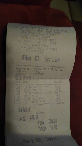 Read moreLes falta mucho aplicarse en el servicio. Pasa mucho cuando tienes prácticamente puro chavo. Por ejemplo, ves como el de la caja le pide a los de cocina que preparen x producto que se agotó. Y el de cocina platicando se molesta que lo interrumpan. Ah, pues ahora me tardo en hacerlas. Y en vez de 7 minutos que te prometieron en tener tu pedido se llevan 20, casi el triple! Pregunta: ¿no sé supone que alguien debe estar atento a que no falte producto para vender? ¿De que antes de que se agote ya se esté preparando el faltante? ¿O es política de la empresa que no se prepare nada a menos que...