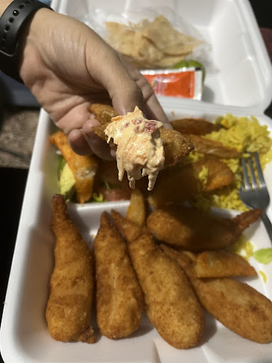 Read morecompré del astillero dice que tarda de 35 a 45 minutos (llego antes) compre un camarón empanizado relleno contiene 7 camarones empanizado rellenos de queso Philadelphia en la foto sale un camarón empanizado normal porque le cambié uno de mis camarones empanizados rellenos por uno de los camarones empanizados normales de mi hermano. En cuanto a los camarones tanto los rellenos como los normales tienen muy buen sabor y le sienta bien el aderezo que agregaron que tiene lo que parece ser unas tiras muy delgadas de zanahorias ralladas. También sale con arroz que la verdad (pudo ser mejor) unos gajos de papas que se parecen a los camarones empanizados normales y que saben bien. Lo bueno es que la sección de la ensalada quedo bien con unas 2 o 3 rebanadas de aguacate un poco de lechuga, cebolla y una rebanada de tomate. En resumen estuvo rico y el arroz puede mejorar (no está...