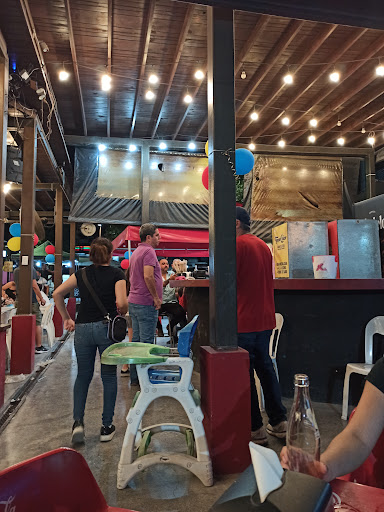 Un lugar con ambiente agradable. Tienen juegos para los más pequeños y televisiones para entretener a los mayores, pero permitiendo charlar. Es un sistema de "Food Trucks", de modo que la comida es variada, no hay un sólo menú para compartir. Tienen hamburguesas, sushi, tacos, pizzas, postres... depende del gusto; pero que no te sorprenda si el día que vayas, ya no tienen una de esas comidas, y se haya sustituido por otra. Lo mejor es ir sin algo en específico y que cada quien pida lo que se le entoje. Los refrescos se venden aparte; una vez que ordenas, y te sientas a tu mesa, un mesero va y te ofrece las bebidas, desde aguas naturales, refrescos, hasta cerveza. Los refrescos los pagas al terminar, pero la comida, al ordenar, en el camioncito. Al menos en donde ordenamos, nos pidieron pagar en efectivo de preferencia, así que consideralo. El área de comedor está techada aunque el lugar es abierto, de modo que está muy bien ventilado. El estacionamiento es pequeño, unos 10 coches, pero estando en una avenida con muy poco movimiento, te puedes estacionar en la...