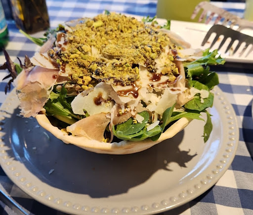 I know.... salad?! This salad has dates, prosciutto, shaved parm, crumbled pistachios, balsamic glaze drizzle...and of course the greens