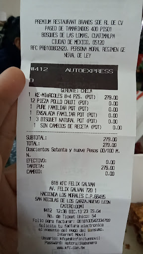 Read morePésimo pase por el auto servicio y para empezar la persona que habla por el Intercom por más que le repetí las orden 3 veces no la apuntaba bien, cuando ya pudo apuntar un orden me dice no tengo te esperas 10 min o no después de tenerme 10 min apuntando la orden y total me dice págame y luego en 10 min pasas de nuevo y como el estacionamiento es de paga me salgo y vuelvo a entrar para evitar el cobro del estacionamiento aguardo 10 min. Y paso de nuevo total ahí me tienes otros 10 min en el carro donde nadie se digno a abrir la ventana hasta que mi novia se molestó se bajó y les abrió la ventana para recibir el ticket y no comentan aún no está y tuvimos que esperar nos dieron puro mugrero y aparte con su cara de trabajadores cagados de la vida y extra me terminaron cobrando estacionamiento $20 varos por querer comer pollito KFC a pesar de que es una comida cara para lo que ya es y tener ese pésimo servicio la verdad es que no se con que cara quieren seguir...