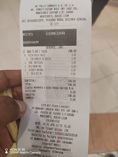 Read more! Desconocen las promociones publicadas de KFC! Fuimos un jueves x la tarde noche estaba la promoción de chicken nights según la página de KFC y una semana atrás la había pedido a domicilio de otra sucursal, hice mi pedido le pregunté a la cajera y está me confirmó mi pedido 14 + 6, debido a que había muchos pedidos adelante había un tiempo de espera de 40 min. Llegó a recoger mi pedido y me lo dan junto con mi ticket y veo q no aplicaron la promoción al reclamar a la cajera y el encargado me dicen " Esa promo ya no está" al decirles q en la página sigue activa y q una semana atrás la había pedido en otra sucursal me dicen " Es que no somos los mismos y q ellos no la tenían, debido a que ya había esperado mucho no me quedé a reclamar solo me fui con el pedido...