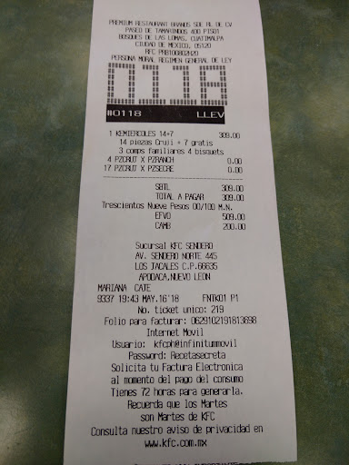 Read moreMiércoles pedimos unas ke tiras normales sin barbiquiú(no se como se escribe) y un paquete de 4piezas con puré y ensalada vía entrega a domicilio.las 4piezas cruji bien solo una parecía de un día anterior las que tiras llegaron pero venían bañadas y mi nieta no las comió jueves fuimos personalmente a comprar lo mismo le dije a mi nieta que verificará si su pedido estaba como ella quería lo hizo y dijo que estubo correcto su pedido al llegar a casa al revisar mi pedido ví que solo traía puré de papa y la ensalada cero era otra porción de puré .esto pasa muy seguido ahora que vuelva a ir tendré que verificar pieza por pieza y abrir los recipientes uno por uno para saber si lo que pido es lo correcto.da pena pero en este año van varias veces que pasa lo mismo .uno como consumidor se forma la idea de lo que vas a degustar é imaginas las combinaciones de sabores.(¿si me explico?) Y cuando destapas o abres las cajas no es lo que pedistes 🤯😤luego hablas para reclamar te envían la llamada atención a cliente y nadie contesta.😒¿usted que haría?la receta y sus...
