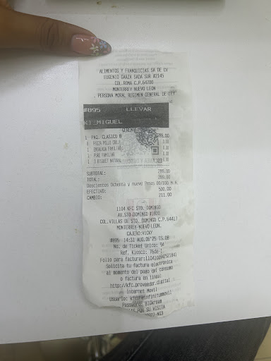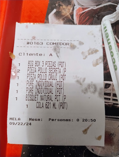 Read moreEs un asco de restaurante, para empezar porque al llegar inhalas toda la peste de agua de drenaje por una mega fuga que hay en dónde se ubica el restaurante y dentro de el el personal te ignora en vez de atenderte o pedirte esperar un momento, muchos de los productos ofertados no los tenían en existencia, el restaurante en general estaba muy sucio y la joya de la corona es el baño, al estar haciendo fila para ordenar llega el olor a orines fuertísimo y si hay necesidad de entrar pues peor. El pollo parece que fueran las sobras, unas piezas que parecía más que pollo una codorniz, no dieron opción de pedir puré y ensalada, dieron dos pures porque no tenían ensalada y ni siquiera te informan eso hasta que oyes que le dicen a otro cliente que se fue a quejar, la coca cola sin gas, la había pedido sin hielo, les digo que me la cambien y me dicen que si tiene gas pero la Zero sin hielo así sabe y me retacan el vaso de hielo y la coca cola sigue sabiendo a agua con endulzante, muy mal, creo que deberían tener a alguien a cargo que si sea responsable y si es necesario tener más personal porque van a perder más cuando nos vayamos los clientes que si contratan...