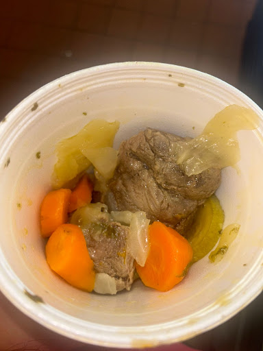 El caldo de res desabrido. Tuve que echarle sal y unas cucharadas de la salsa verde de la mesa, la cual no tiene tan buen sabor. Aparte, el caldo sólo viene con UN limón pequeño y en mi opinión para los caldos se necesitan más limones pues se diluye mucho en el agua. La papa siempre roba sabor y en este caldo viene más papa que carne y la poca carne que trae son partes con nervios.