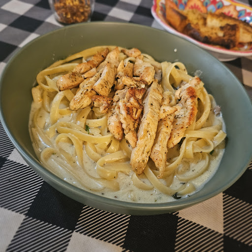 Pedí un fettuccini con pollo, champiñones que si cortaron uno fue mucho y albaca, que también si le pusieron un hoja creo que exagero. Repito el sazon de esta pasta era muy bueno, pero que no estuviera al dente y que la porción de fettuccini se quedara un poco corta, el pollo bastante bien.