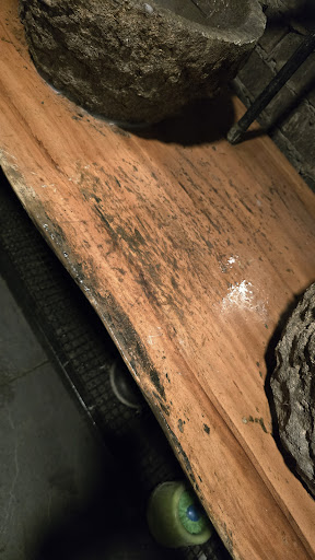 El baño olía horrible, y la mesa del lavabo estaba llena de Mo.