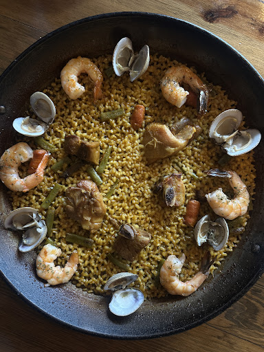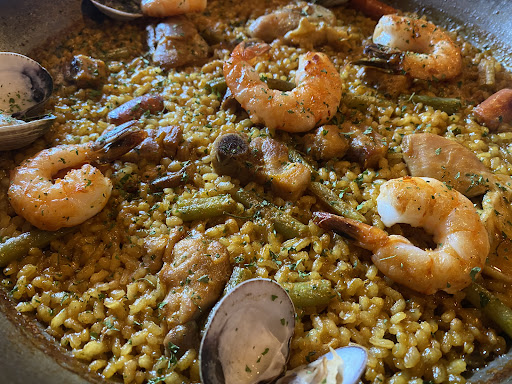 Por el costo la verdad esperaba mas de la comida, pero todo es mejorable, empezando por la propia paella, ignorando el hecho de que solo tenia 3 camarones (que esperaría fueran los gigantes y ahi no habría problema), los ingredientes podrían ser de mejor calidad, la carne de las almejas era muy poca, el pollo a mi parecer estaba en buen punto, el cerdo estaba duro y chicloso, no se podía masticar, el arroz estaba batido, pastoso, y el sabor no es de azafrán (como debería ser), era del resto de ingredientes, pasando a la ensalada, podrían evitar cortar el tomate en cubitos, aunque eso no es molestia, y talvez podrían mejorarla poniendo directamente la vinagreta en la ensalada, por cierto la vinagreta de pesto estaba deliciosa, sobre la tabla de queso y jamón serrano, mejoren la calidad del jamón serrano, no tenia muy buen sabor, del queso no puedo hablar porque en general no me gustan los quesos fuertes, respecto al pan de ajo, la mayonesa con la que venia acompañado tenia buen sabor, el problema fue la mantequilla de ajo del propio pan, o no tenia suficiente mantequilla o le faltaba ajo a la mantequilla.