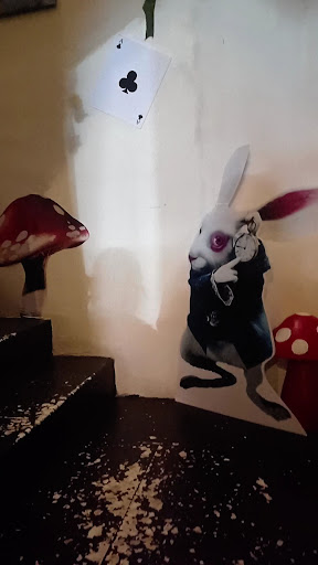 Read moreEs un lugar accesible, y cerca en el área de Santa Catarina. Esta en el 2do piso y desde las escaleras esta decorado con temática de Alicia en el País de las Maravillas 🐇♦️🌹. El lugar es pequeño pero esta muy bien decorado, tienen pantallas dónde se ilustra la película de Alicia en el País de las Maravillas, música de fondo tranquila. Un personaje de el Sombrerero Loco, con el que te puedes tomar fotografías. Hay un pequeño espacio dónde también te puedes tomar fotografías, es un sillón, decorado y algunos accesorios que tienen para que los incluyas en tus fotos 📸. Los precios de la comida son accesibles y buena, es muy agradable, puedes ir en pareja, amigos, etc. Tienen dos turnos uno en la mañana que la comida son más de desayunos - almuerzos, y otro por la tarde - noche que ya es otra variedad de platillos. El único inconveniente que tuvimos fue que al ingresar al lugar, nadie nos atendió estuvimos más de 25 min, esperando a que algún mesero se nos acercara a darnos el menú y que nos atendiera, ya de ahí en adelante todo lo demás...