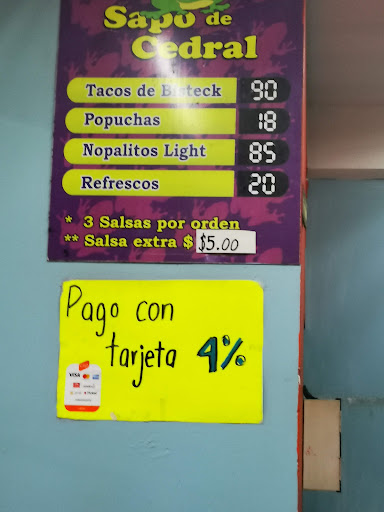 Read moreBien, lo que dire es que no es un lugar supercool, pero cumple con el propósito de tener una opción más, lo que me agrado es que te sirven unos tacos 🌮 no grasosos de bistec 🥩 aderezado con sus ricas salsas y lo que sorprende es que te dan nopalitos guisados y cebollita guisada, dándole un rico 😋 sabor a tu paladar rompiendo lo tradicional y por si fuera poco unas suculentas papuchas hechas de queso 🧀 y carne de puerco únicas en su especie jeje 😂 y sabrosas acompañalas con una rica agua de guayaba, limón mango, Jamaica o un refresco ve y atascate de sabor.. Tacos del sapo...
