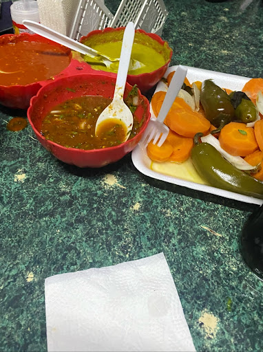 Tienen 4 tipos de salsas: 2 verdes, una de las cuales es tipo guacamole y 2 rojas, una de las cuales es tipo tlaquepaque, sobre todo las rojas de muy buen sabor y más picositas que las verdes.