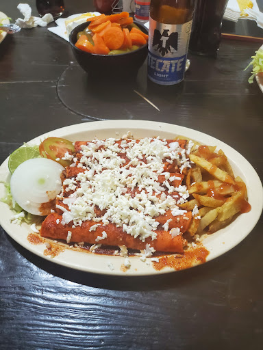 Loa tacos son tostados y color rojo como el color de las enchiladas. Llevan carne molida, lechuga, tomate y cebolla. Si quieres quitar uno o mas de estos elementos hazlo saber y te complaceràn con gusto. La carne está bien condimentada con buen sazòn y la orden consta de 6 tacos. Si quieres menos hazlo saber y te sirven la cantidad que desees solamente, o puedes llevarte los que no puedas consumir. El precio está excelente y comparable a cualquier orden de tacos de 5 en cualquier otra parte lo que considerè muy competitivo. El restaurante es sencillo pero con ambiente agradable y hay mesas tambien en el exterior. Muy buen trato aunque el servicio se hace lento cuando hay muchos clientes. Muy accesible , a la orilla de la Carretera Nacional . Cuando hay mucha clientela vas a batallar para encontrar...