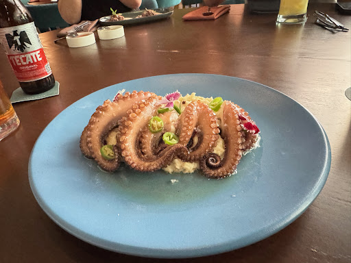 Yo ordené Pulpo confitado en vainilla con puré de elote y agua de horchata con mango. El pulpo no estaba bien cocido, quedó chicloso. El puré de elote era como comer pan de elote, que después de dos cucharadas te empalagaba. En el agua de horchata el sabor a mango era imperceptible, el horchata sabia a leche de almendras.
