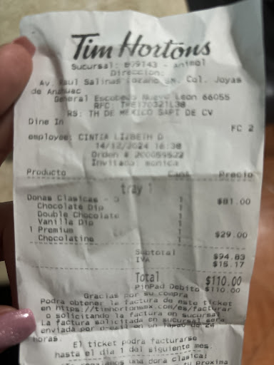 Read moreTim Hortons Plaza Animol Un desayuno rápido y a ver lia resultados de ciclo 12 . Claudia Erika y Roxxana son ganadoras de una tarde de spa, que ya luego les reseñaré. El lugar esta bien posicionado en la plaza, con mesitas afuera . Nos sentamos en la zona de sofás para que Mary, que venia con problemas de rodilla no batallara en las mesas altas. El lugar estaba con el clima fresco, muy agradable para mi, aunque muy frio al decir de mis lideres No habia internet, asi que guardamos las laptop y sacamos los celulares, después de deleitarnos con cafe, croissante, chocolate y algún panecito. Volveremos a ir esperando que la falla técnica...