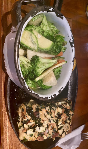 Salmon topped with roasted almonds was a culinary masterpiece, combining succulent fish with crunchy nuts. The salmon fillet, seasoned and pan-seared to perfection, boasts a tender, flaky texture. Roasted almonds, thinly sliced and golden-brown, provide a nutty crunch that complements the buttery salmon beautifully. This dish is not only a delight to the palate but also a feast for the eyes. Accompanying the salmon, the vibrant steamed vegetables—broccoli, zucchini, carrots, and cauliflower—add a burst of color and a fresh, healthy contrast. The vegetables, lightly seasoned to enhance their natural flavors, are served in a rustic white enamel bowl, chipped for a touch of vintage charm. Together, the rich salmon and the crisp vegetables create a harmonious blend of flavors and textures, making this dish a standout choice for a nourishing and...