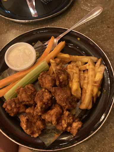 Muy buena atencion del personal, pedi un platillo de nombre "nunca he venido" ya que fue la primera vez que visite el lugar, el cual en general esta bien, dentro del local el area esta climatizada, los acabados algo rusticos le dan un toque acogedor y muy vistoso. La comida esta bien presentada, dado que todos los platillos son a base de pollo, se las arreglan para darle una buena presentación, hay una buena variedad de salsas para todos los gustos, desde salsas agridulces y a base de soya, hasta otras muy picantes a base de chile de árbol, vale la pena experimentalas todas. El platillo que pedi estaba muy bien presentado y ademas de las diferentes variedades del pollo, esta acompañado con papas fritas y jalapeños empanizados rellenos de queso crema, tambien queso empanizado que complementan muy bien al platillo. El menu esta variado, ademas del pollo en sus diferentes presentaciones, también tienen hamburguesas y ensaladas, todo es a la carta. Este local cuenta con mesas y servicio al aire libre y tiene una barra de bebidas alcholicas con gran variedad de las mismas. Los baños estan limpios pero pequeños y la distribución algo incomoda.