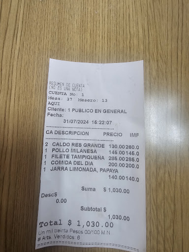 Para mi gusto el mejor caldo de res de Monterrey, una porción amplia y con mucha carne. Tal vez su único defecto es ser servido en un bowl promedio y no por tanta carne y verduras no hay mucho espacio para el caldo en si.