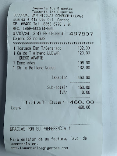 Read moreNo he tenido mayores problemas con el negocio porque siempre han trabajado seriamente y he disfrutado su comida, es por lo cual voy a la matriz en lugar de la sucursal de escobedo que es la mas cercana a mi domicilio, sucursal cuya atención deja mucho que desear, pero esta ultima vez en la que personalmente llego a realizar una compra en la que incluyo unas enmoladas, las cuales al llegar a casa encuentro que son unos tristes tacos de pollo, el que ni siquiera esta sazonado con sal, ni pensar en que acompañaran una bolsa de mole, pues da hasta pena ajena comerlas, esto solo sirve de experiencia para una “proxima” vez, gracias por participar taqueria los Gigantes.
