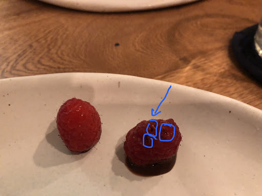 The “pre-dessert” really disappointed me since I had stated when booking that I was gluten-free and couldn’t eat wheat. They asked again when we were seated for dinner. And then the waitress checked with the chefs when we ordered. YET I was served sourdough bread with smoked cheese and honey for the “pre-dessert”. The waitress apologized but didn’t offer a replacement or offer to take away the dish, she just left it and served other tables. I ended up giving the course to my friends. As a dish, the opinion is that the smoked cheese overpowered the honey and even though the bread was soaked in the honey they couldn’t taste any of the almoraduz, which was disappointing as it is the restaurant’s namesake.