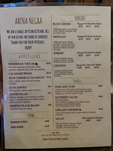 Read moreIt was a quiet and stormy night with a beautiful setting at Arena Negra. The entrance was hidden so keep a keen eye out and climb the staircase to this beautiful restaurant. The Fisherman Tiritas were unlike anything we’ve had before. So fresh and wonderfully delicious. They were out of a couple of options I originally wanted but the hostess and chef were very accommodating and thorough as to why they wouldn’t offer any subpar meat or at least the freshest available, so I opted for the shrimp in coconut sauce and it was divinely sweet and succulent. My partner had the tasty, super fresh shrimp tacos. Beautiful setting, with a wonderfully set price menu. Go visit if you’re...