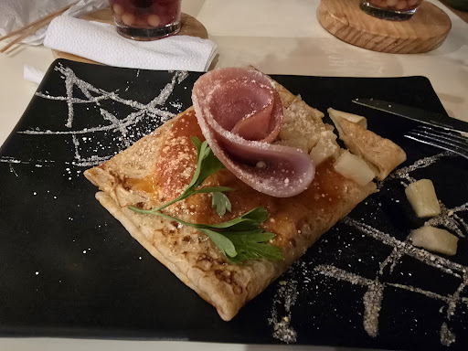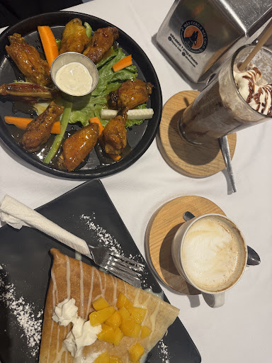 The ciabatta roll was delicious but came out super late—after we were almost done eating—because they forgot it. Most of our table ordered sweet crepes, which were decent but nothing special. One had way too much chocolate sauce, and the savory Hawaiian crepe could’ve used more pineapple. The mango habanero wings were more sweet than spicy, so a bit disappointing.