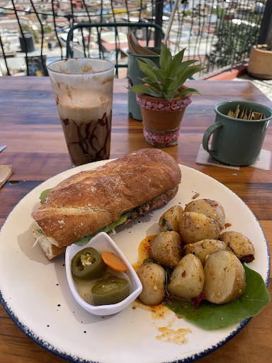 Now, the food. I had an excellent frappe and the baguette del Valle which has a bunch of standard Oaxacan ingredients like quesillo, chile de agua and tasajo. It was very good. Clearly quality ingredients. I had them sub out the salad for papas bravas and they were expertly spiced and cooked.